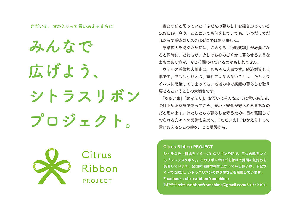 シトラスリボンプロジェクトは、差別をしない「安心の目印」として「地域」「家庭」「職場(学校)」を象徴する3つの輪をかたどったシトラスのカラーリボンをつけ、感染しても「ただいま」「おかえり」と言い合える世の中を願い、新型コロナウイルス感染症が流行し始めた2020年4月に愛媛県内在住の有志が集い、同団体を立ち上げました。